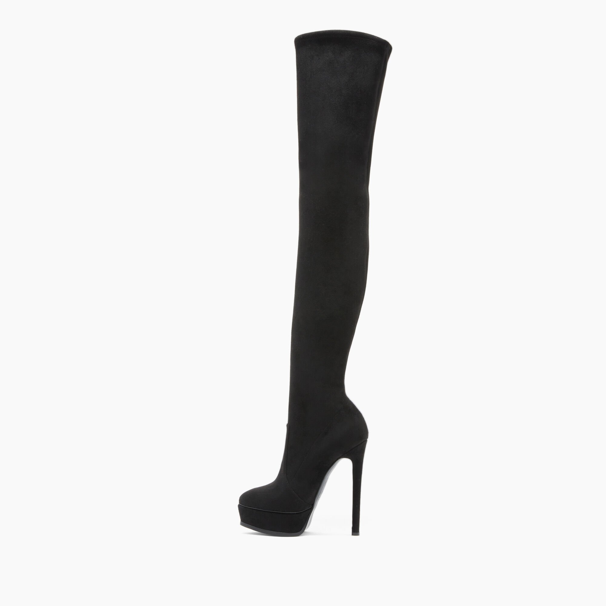 Lo spirito sensuale dello stivale in morbido eco-camoscio nero stretch sopra al ginocchio viene evidenziato dal vertiginoso tacco